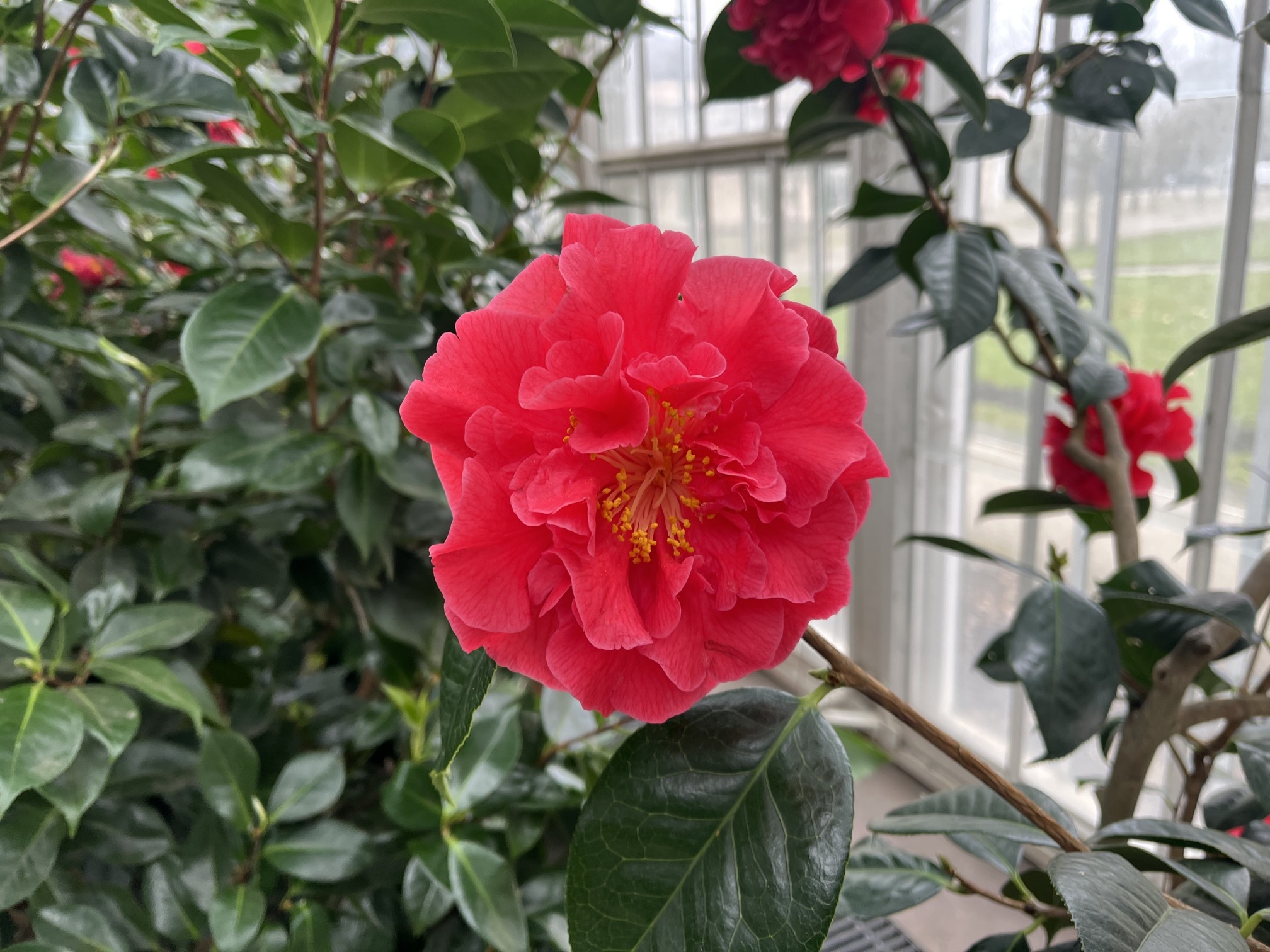 Camellia japonica ‘Emma’ ist eine rotblühende, mittelgroße, klassisch anmutende Sorte, die durch ihre paeonienförmigen Blüten und ihren kräftigen, aufrechten Wuchs auffällt. Sie gehört zu den Sorten, die eher warm überwintert werden müssen und sich besonders gut für Kübel und Wintergärten eignen.