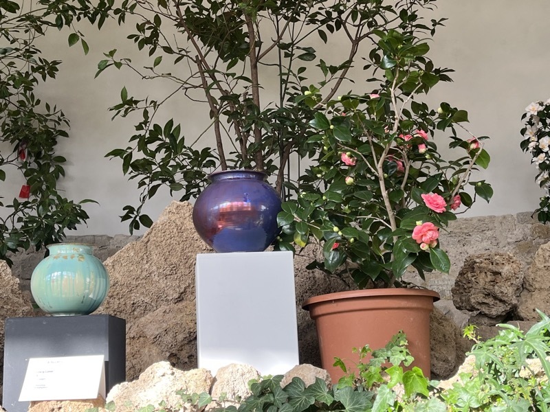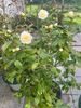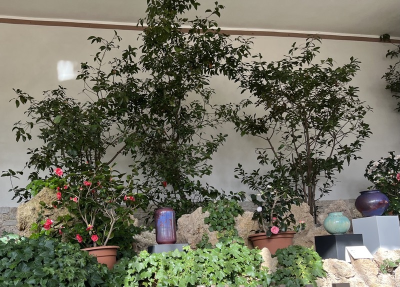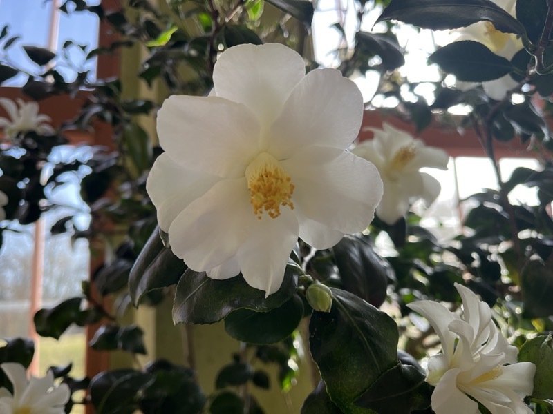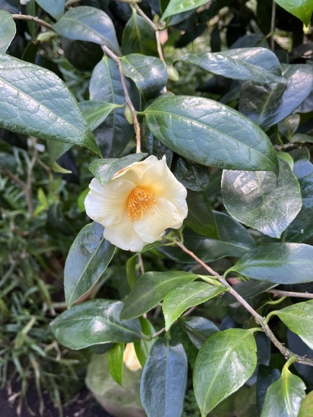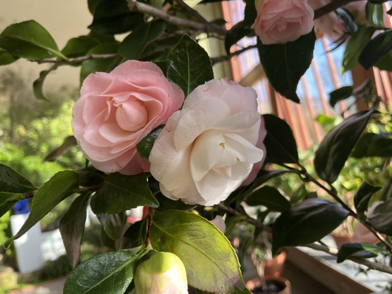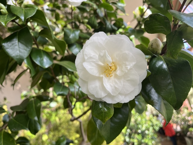 Die Bokuhan ist eine besondere Kamelienart, und es ist spannend, dass sie dieses Jahr einen Austrieb und eine spezielle weiße Blüte entwickelt hat. Die Bokuhan habe ich 2016 gekauft. Wenn sich der Austrieb unter der Veredelungsstelle befindet, könnte es sich möglicherweise um einen Trieb der Unterlage handeln – das ist interessant zu beobachten, um zu sehen, wie er sich weiter entwickelt.